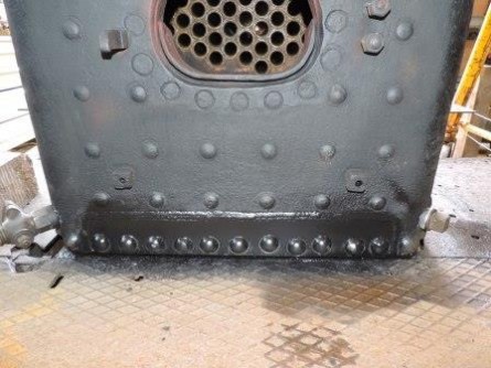 Das Ausrohren des Kessels war ebenfalls nicht ganz leicht, da einige Rohre notdürftig verschweisst worden waren. Auch da zeigte sich der Kessel nach der Reinigung erstaunlich gut erhalten - Stehbolzen, Deckenanker und Langkessel ohne grosse Abzehrungen, die Aussenwände nur im hinteren Bereich des Stehkessels infolge des Kohlenstaubes zusammen mit Feuchtigkeit etwas abgezehrt. Wasserseitig auf Höhe Bodenring ebenfalls rissartige Abzehrungen.